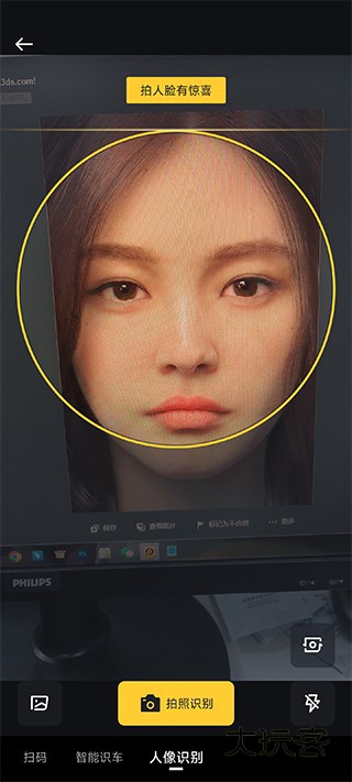 3、这时将人脸放进黄色的方框中,点击【圆点】拍照,等待几秒结果就出现啦。