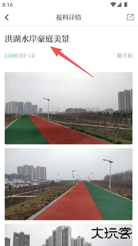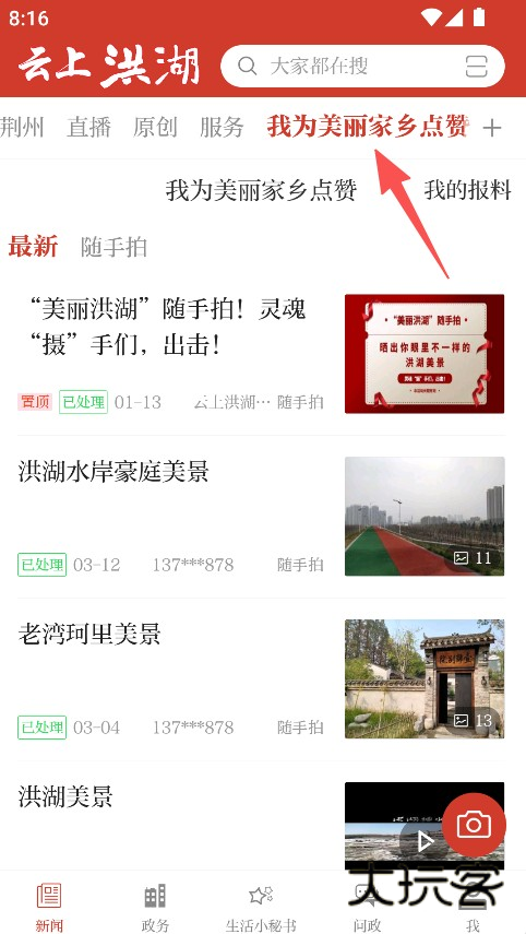 1、进入 “我为美丽家乡点赞”,查看报料详情。