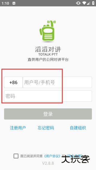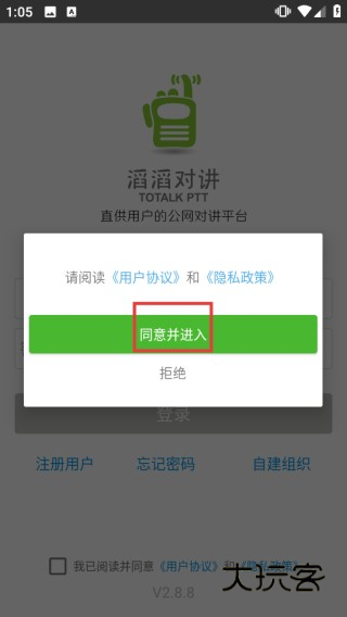 1、打开“滔滔对讲”应用,在弹出的提示窗口中点击【同意并进入】按钮,接受相关协议后进入应用。
