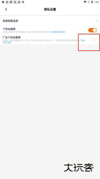 3、在弹出来的界面中,关闭广告个性化推荐右侧开关即可。
