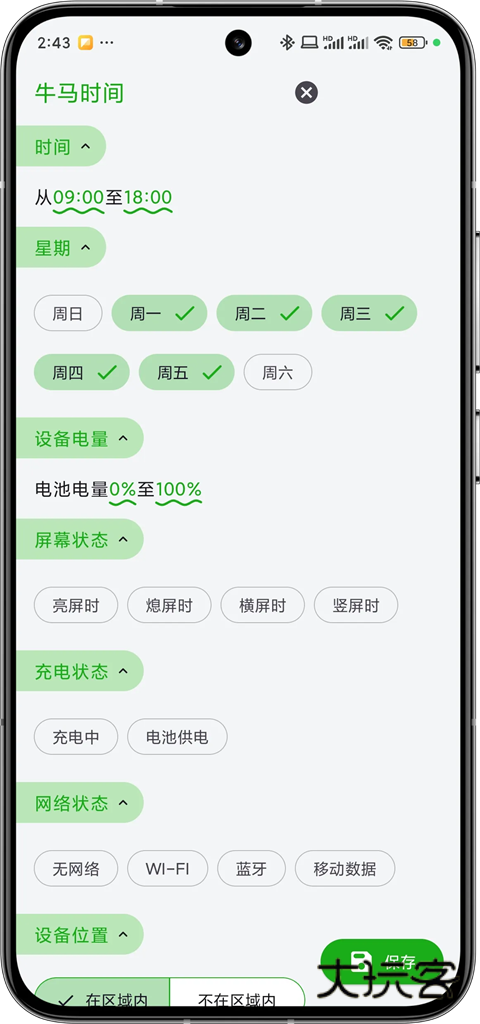 目前支持 时间、星期、设备电量、屏幕状态、充电状态、网络状态、设备位置 七个条件自由组合(所有条件均符合,该场景才会生效,不符合的条件会显示为橙色),基本可以覆盖大部分生活场景,