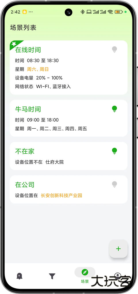 例如,你可以如图通过 时间段 + 星期 + 设备位置 来定义一个上班的场景。