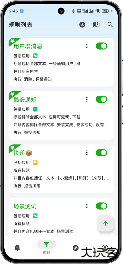 2、第二个 Tab 页面就是规则列表了,该页面记录了所有你自定义的通知匹配规则。它们决定了如何匹配系统通知,执行什么操作,并将匹配到的通知以及执行记录等信息保存在通知列表。