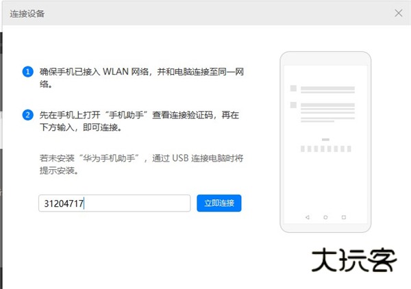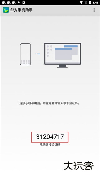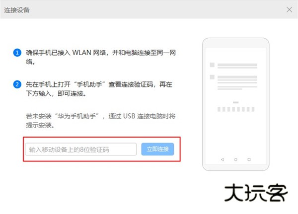 先在手机上打开“手机助手”查看连接验证码,再在下方输入,即可连接。