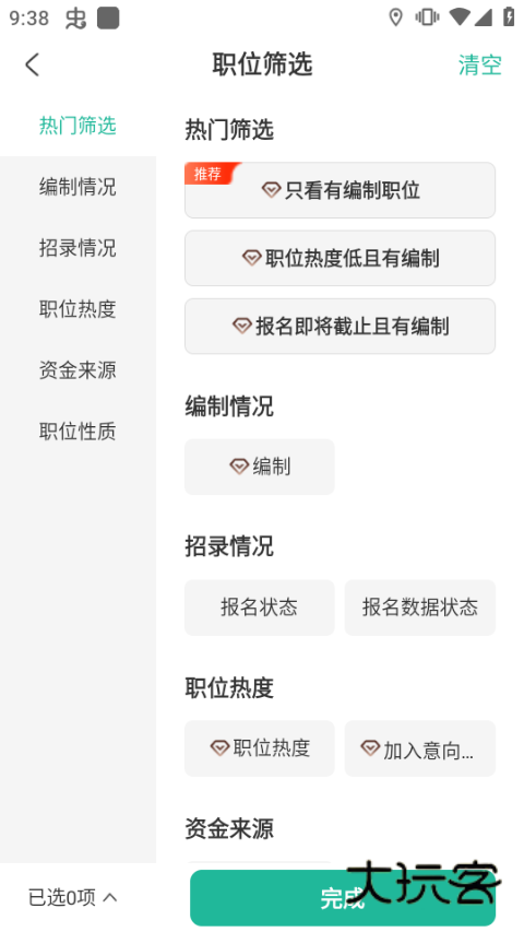 3、“职位筛选”中一共包含编制情况、招录情况、职位热度、资金来源、职位性质等多个大分栏