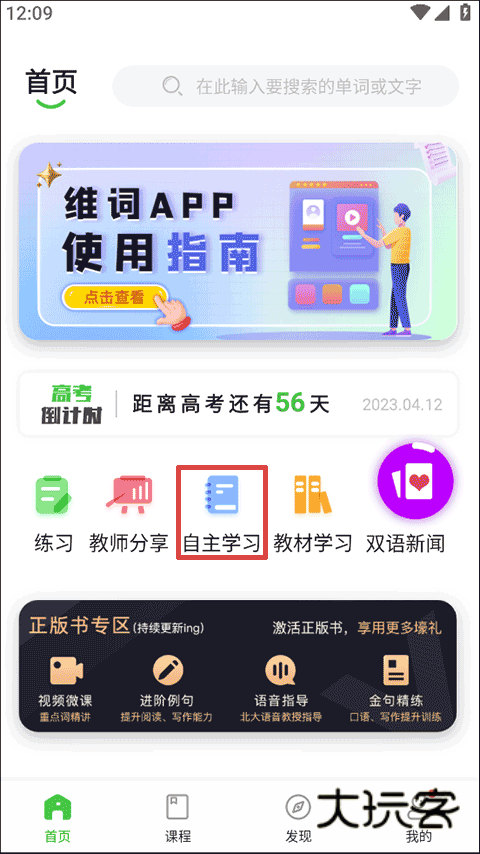 4、同学们也可以在首页找到并点击“自主学习”功能选项;