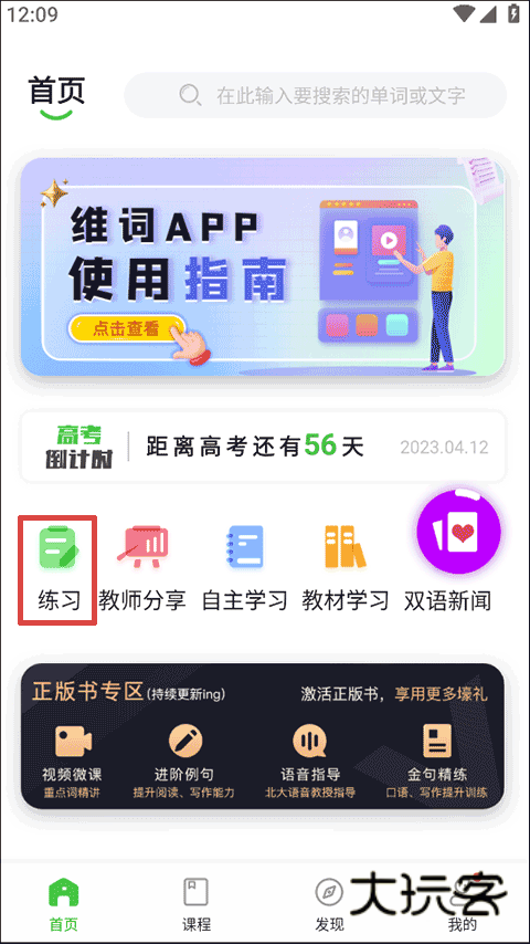 1、打开在本站下载安装好的应用,在首页找到并点击“练习”功能选项;