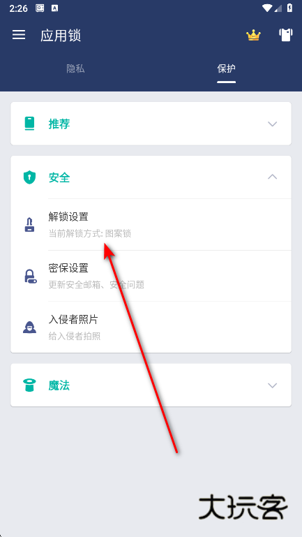 打开应用锁,左侧菜单,设置,解锁设置。