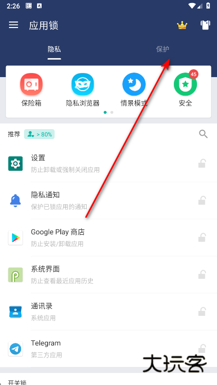 打开应用锁,启用高级保护。启用高级保护之后,没有密码无法强制关闭和卸载应用锁。