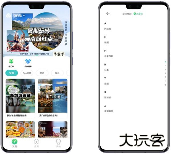 在出境易“发现页”内,有全球热门旅游国家和地区的相关资讯。内容涵盖APP攻略、旅游推荐、娱乐项目、热门景点等,通过切换左侧查看