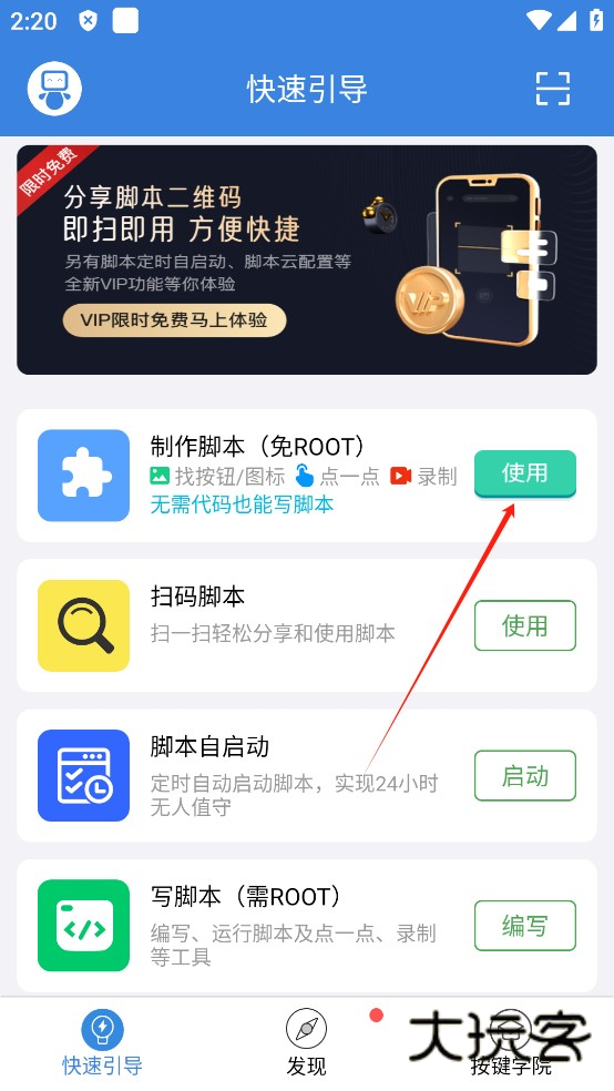 1、下载并打开按键精灵,赋予按键精灵root权限后,点击制作脚本后方的使用按钮;