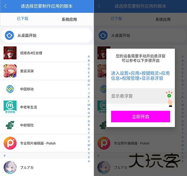 3、选择想要执行脚本的应用,并按照提示打开悬浮窗权限;