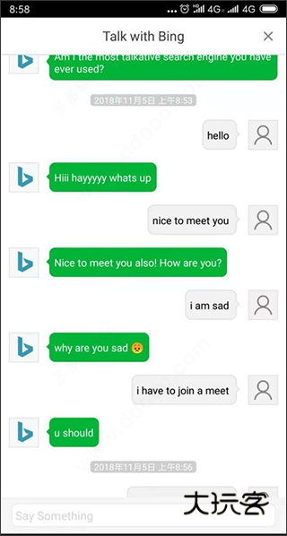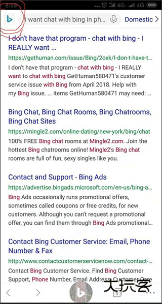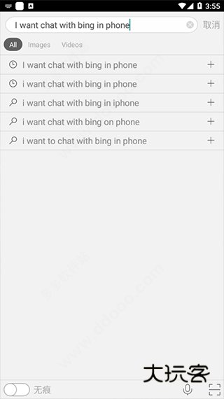 2、在输入框中输入“ I want chat with bing in phone", 手机上输入其他的文字不会调出 AI对话机器人,只有简单的搜索功能。
