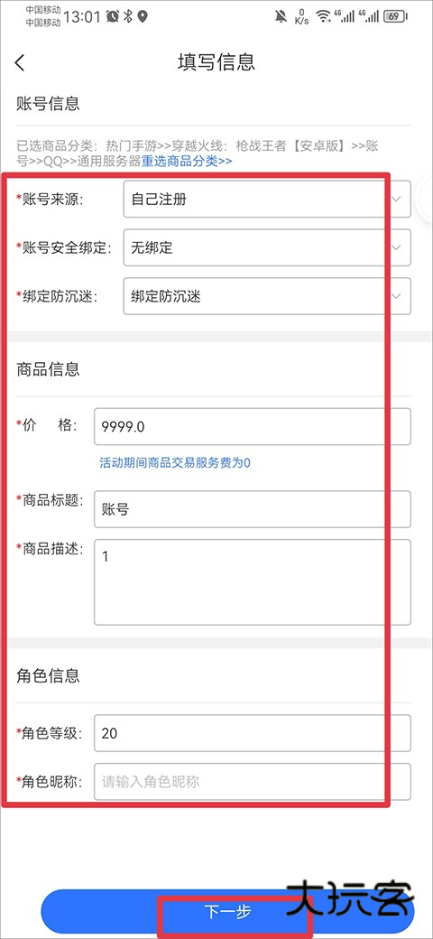 3、例如热门手游穿越火线,进入后选择账号-渠道-服务器后,将页面信息填写完成并点击下一步;