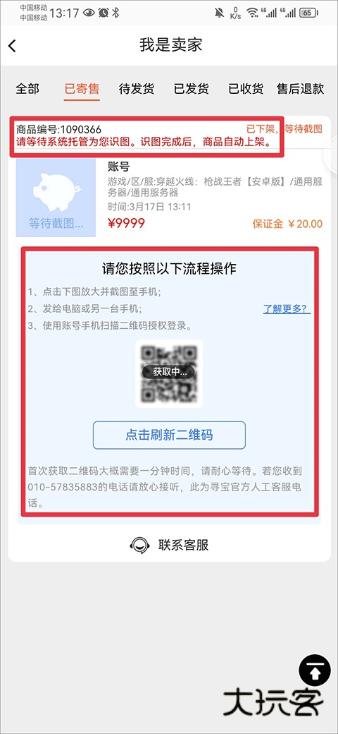 7、最后在已寄售界面内按照提示操作,并等待系统托管客服为您识图,识图完成后商品会自动上架;