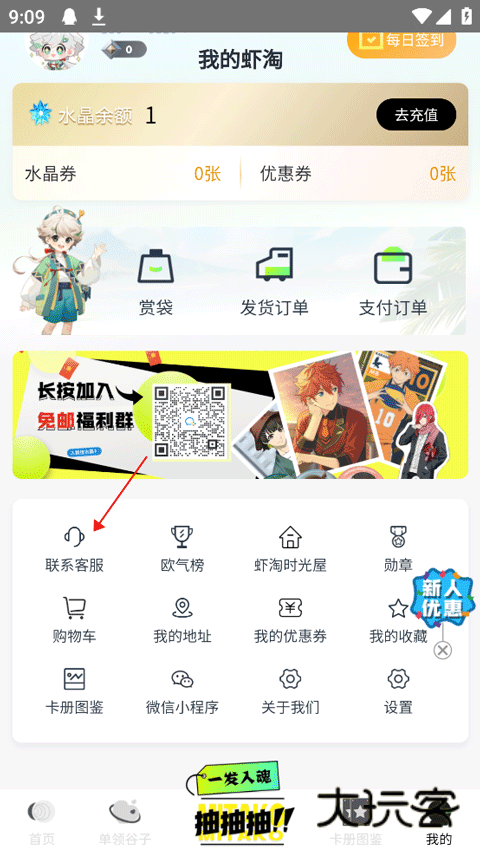 1.首先用新手机号登录Mitako虾淘,在【我的】界面点击【联系客服】。