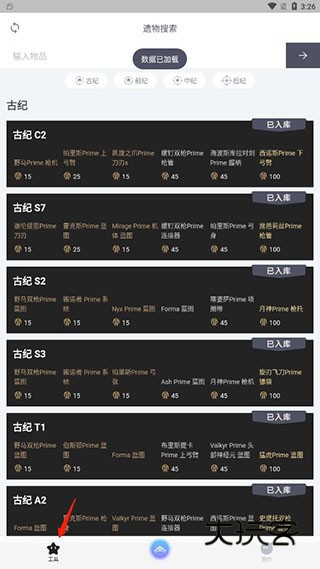 2. 装备管理:创建战甲属性比较模块,支持MOD组合效果模拟和遗物掉落概率计算。
