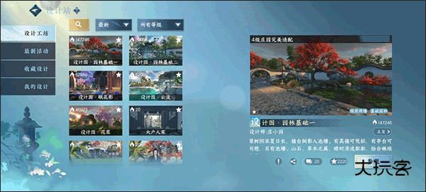 6、设计站就在建设图标图标的左手边,点击后就可以在跳转界面的设计工坊中,看到各位大佬设计好的作品啦,我们可以看看别人设计出来的精美庄园,只需要我们选择想看的设计,然后点击参观就可以啦~