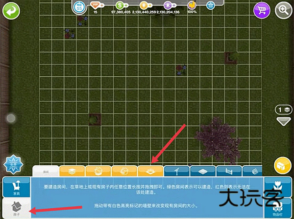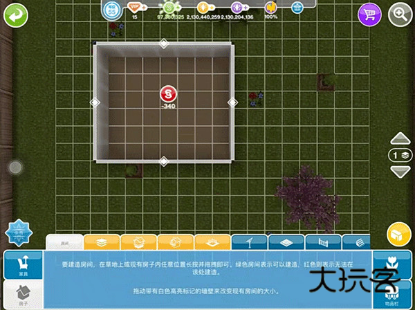 7、在格子上长按并拖拽出你需要的房间大小即可,建造好房间大小后你还可以在商店中购买各种装饰品装修房间。
