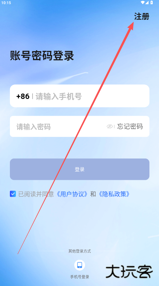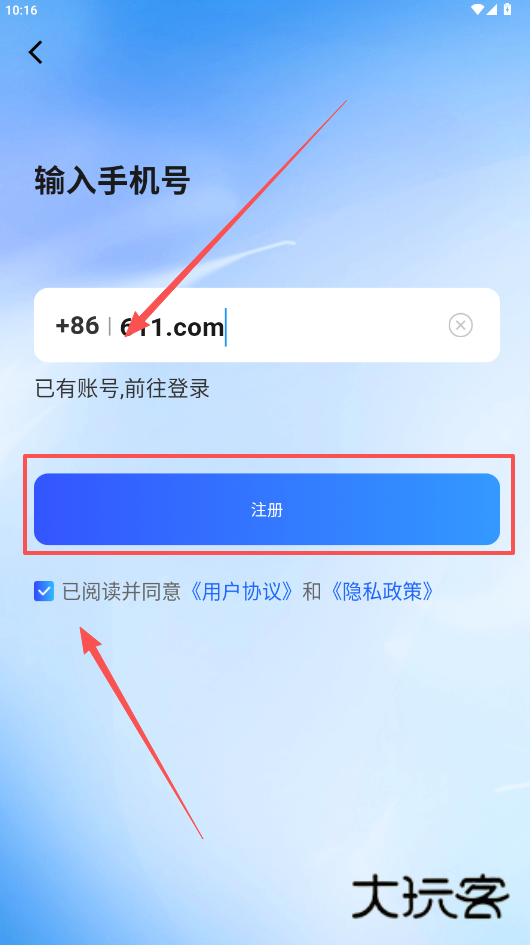 2、输入使用者手机号码,点选下方的用户协议和隐私政策“注册”。