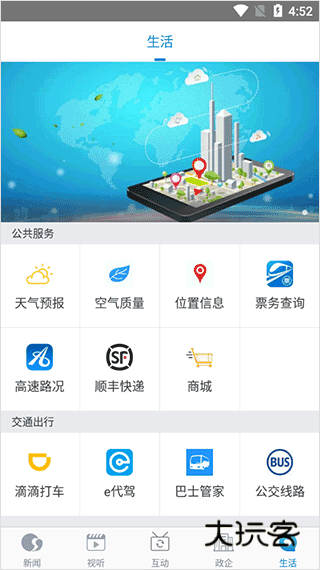 5、在生活页中,用户可使用公共服务和交通出行功能,让用户可随时查看公交路线。