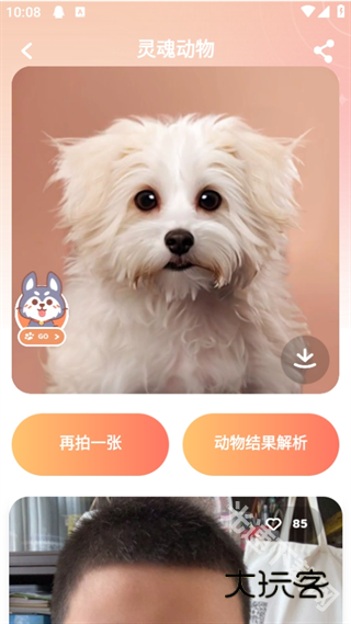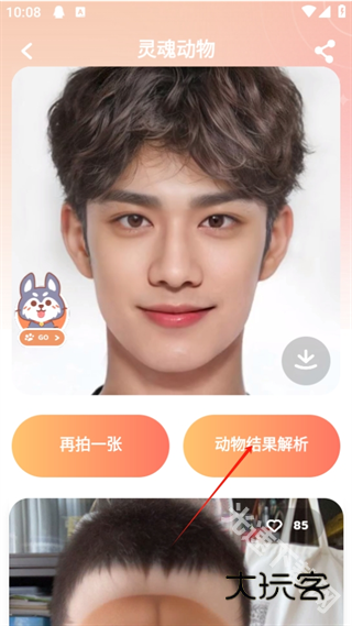 3、拍摄完成之后系统将自动辨别以及更改形象,使得照片转变为具有个人特色的小动物,如果想要保存可以点击右下角的下载处;