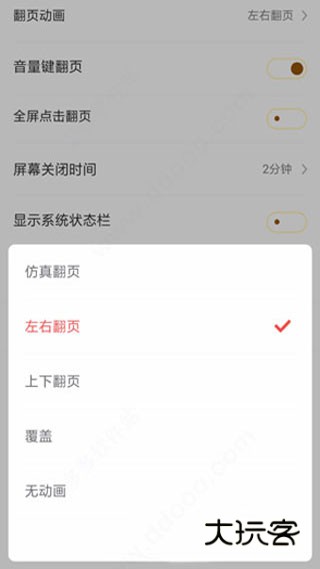 4、进入之后,你会看到翻页动画。翻页动画就是阅读时翻页的效果设置,点击进入即可选择。