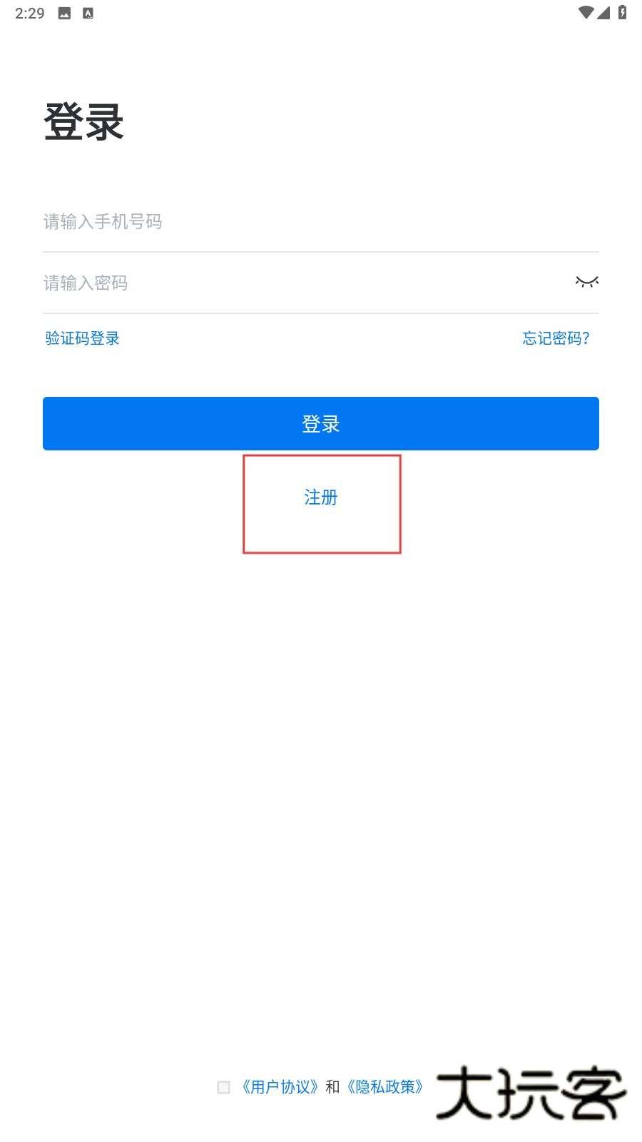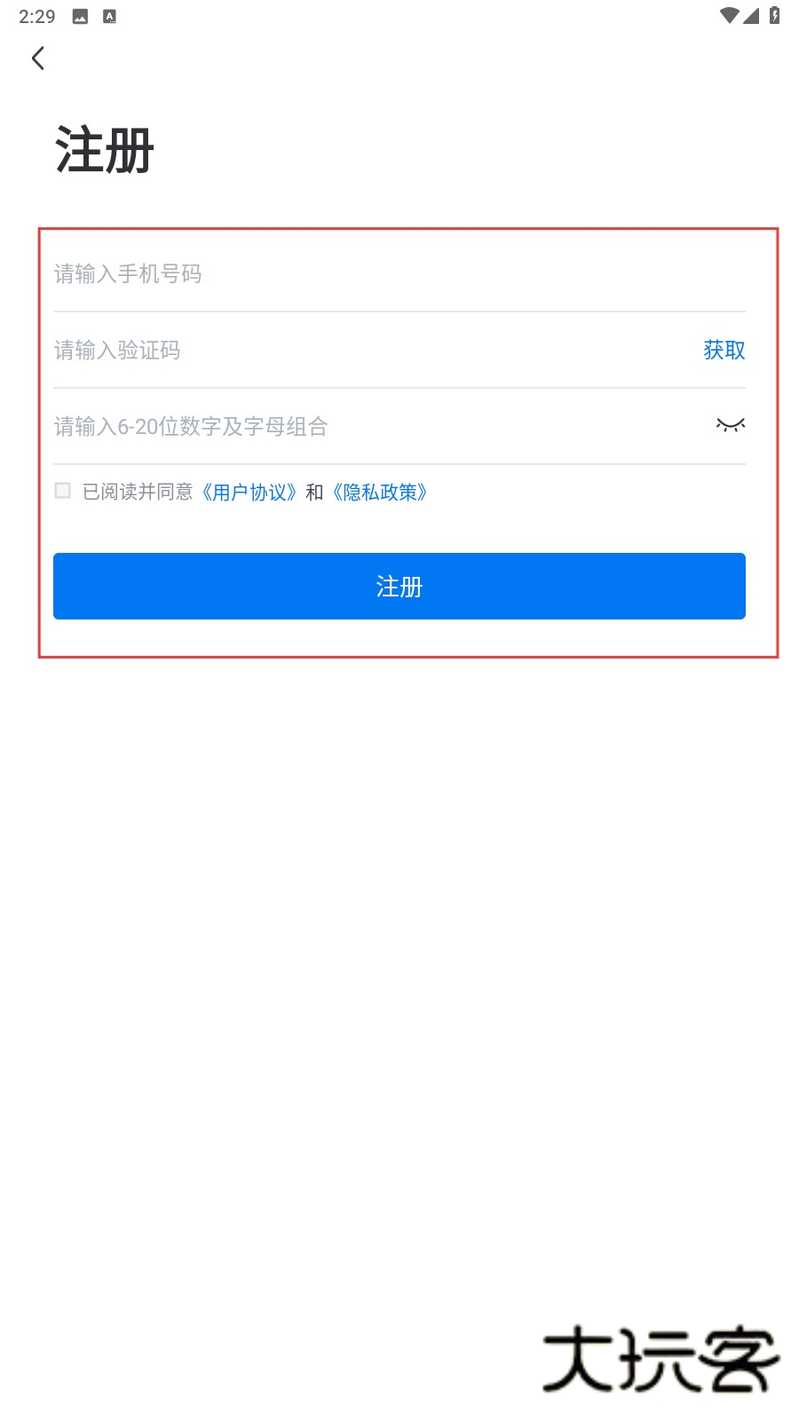 3、注册时按要求填手机号、验证码、密码,勾选协议后点【注册】完成注册。
