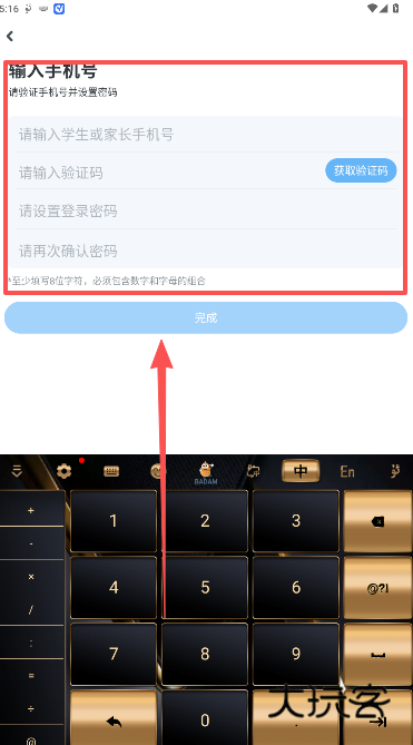 6、继续完成当前页面的信息输入,填写家长手机号码短信验证点击完成。