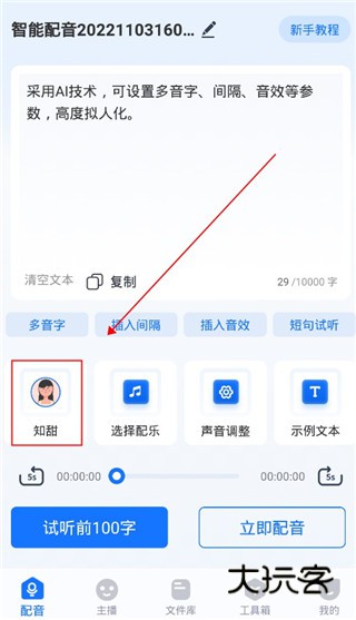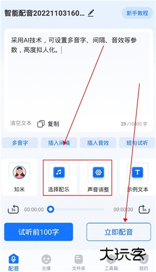 4、选择完毕后可以设置背景音乐和声音间距,然后点击立即配音即可