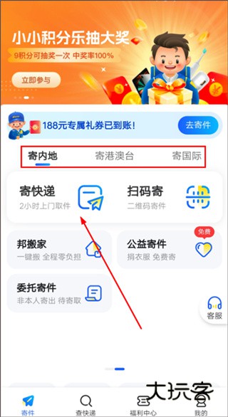2、在主页面选择需要寄件地方:【寄内地/寄港澳台/寄国际】,之后再点击页面内的【寄快递】选项即可;