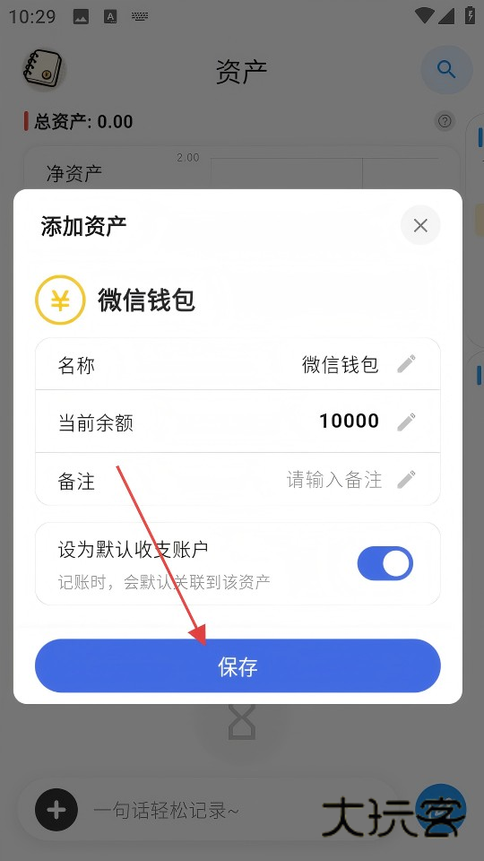 3、在弹出的【添加资产】弹窗里,选择【微信钱包】,填写好当前余额等信息,随后点击【保存】按钮。