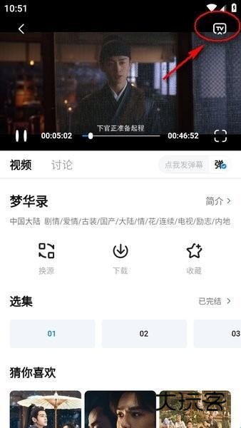 2、然后打开大师兄影视,播放想看的视频,点击右上角的“TV”图标,如图所示。