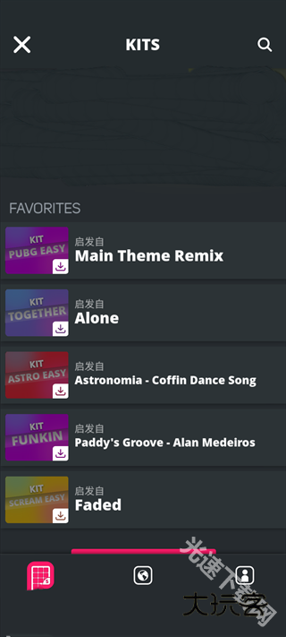 如图所示,左上角加粗的字体为音乐包的名字。寻找所需的音乐包只要点击KIT就可以找到列表。