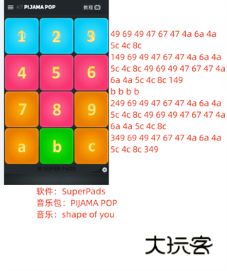 2、乐谱右侧的数字和字母分别对应乐谱上的数字和字母,并且靠得很近,表示需要同时按下。