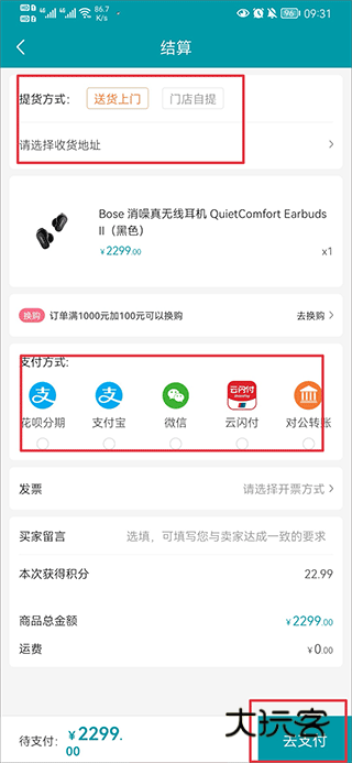 4、最后将收货地址填写完成后,选择支付方式并完成支付即可,需要分期付款的用户可以在支付方式中选择花呗分期