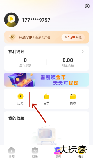 想要删除星芽短剧历史记录,就需要先完成手机号登录,之后,点击“历史”,进入“观看历史”界面。