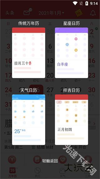 3、在点击一次,将会回到主界面,点击右侧的黄历,可以看到中国传统黄历