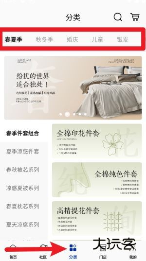 4、在“分类”页面中,根据春夏季、婚庆或银发人群等主题筛选所需家居系列商品更高效。