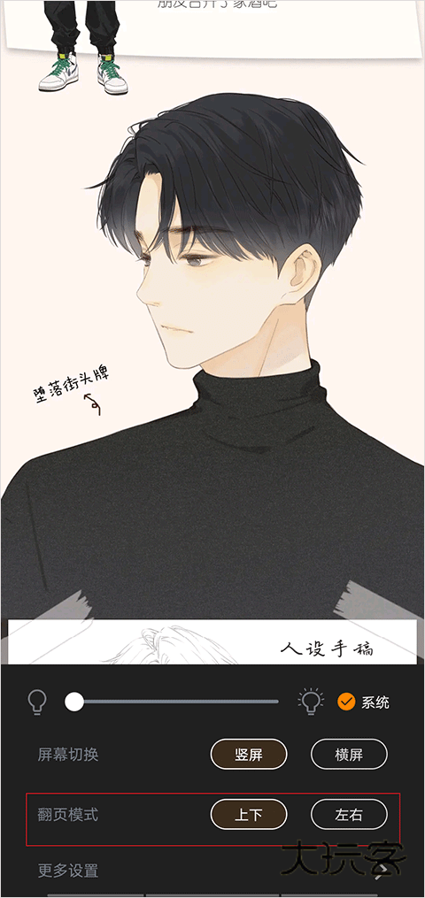 2、同样是在漫画界面点击界面会显示设置,在设置中可以切换翻页方式,选择你习惯的方式即可。