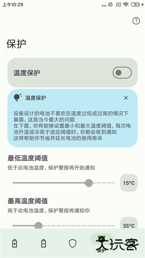 6、开启充电保护,可以防止温度过高,延长电池的使用寿命。