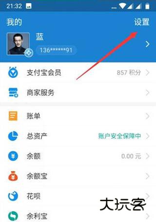 打开支付宝,点击右上角【设置】;