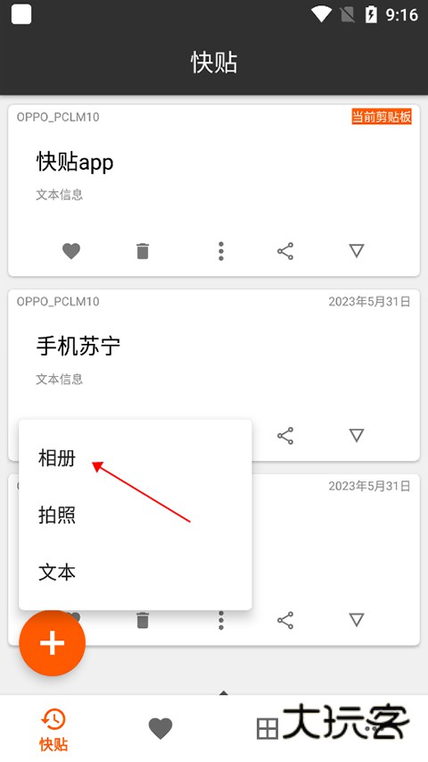 1、用户在手机上的快贴app中点击【+】图标,在弹出的下拉选项中点击【相片】或者【拍照】