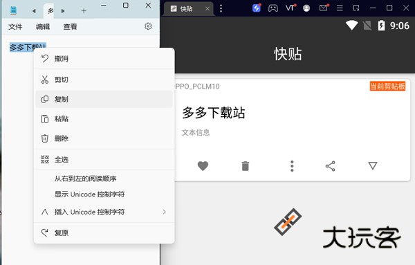 2、反之你在安卓模拟器上(相当于手机了)复制一段内容后在电脑上进行粘贴时同样是刚才手机上所复制的内容