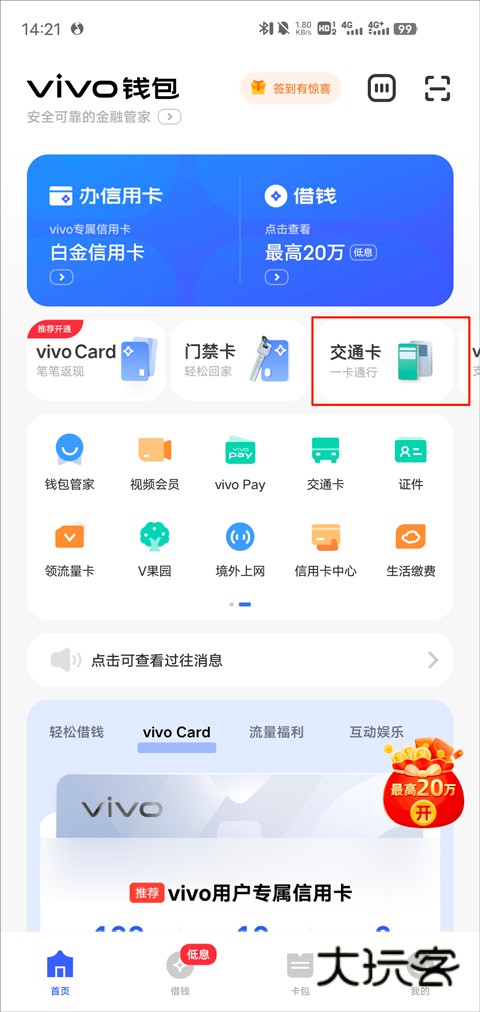 3、然后在手机的桌面里面找到钱包应用,需要点击进入,进入钱包的首页,在最下面位置有一个“卡包”选项,点击进入里面就可以看到交通卡。