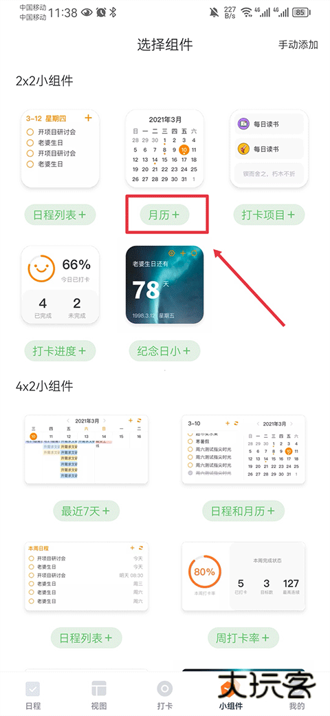 1、在小组件界面中,选择你要添加的组件样式,然后点击组件下方的+号