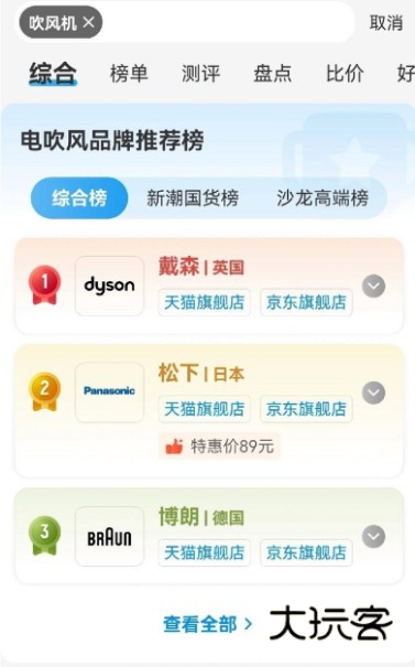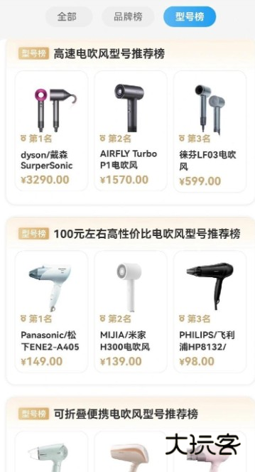 4、在型号榜中,盖得排行会根据同类产品主打的不同功能而进行排行。以吹风机为例,型号榜根据性能、价格等因素做了详细的划分。