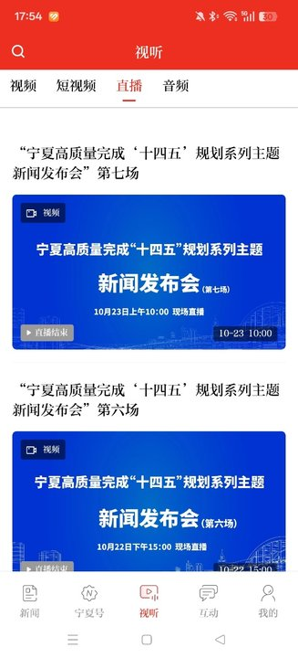 1、宁夏日报电子版直播内容发布集中在视听区,点击下方面栏目切换。