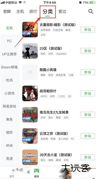 2、选择上方标注位置的分类,进入游戏分类专区;
