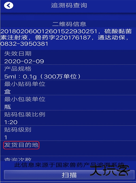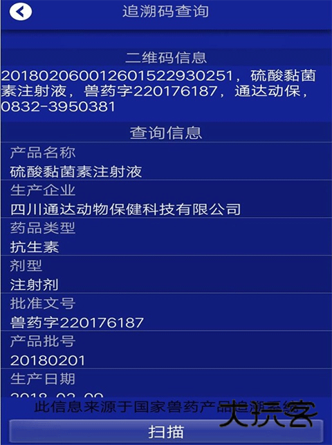 为用户提供兽药二维码溯源相关的信息查询服务。用户用APP扫描二维码后,会在追溯系统中提示追溯码是否进过仓库或出过仓库,方便识别产品的合法性。